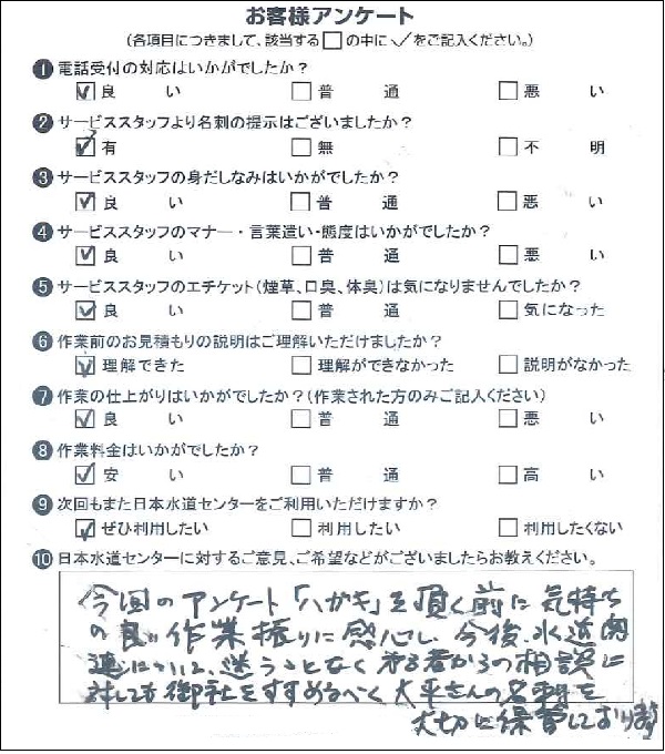 今回のアンケート「ハガキ」を頂く前に気持ちの良い作業振りに感心し、今後水道関連について迷うことなく第3者からの相談に対しても御社をすすめるべく大平さんの名刺を大切に保管しております
