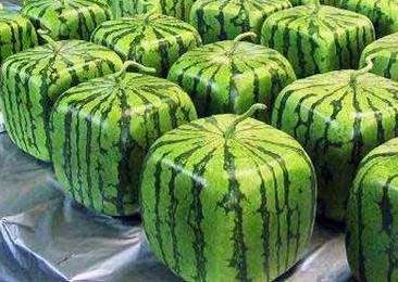 四角スイカは同市のみで栽培される特産品。1辺約18センチのプラスチック製の箱内で育てます。手間暇がかかるうえ、栽培管理技術が難しく、出荷できるのは8割程度。生育途中で収穫するため、甘みが乏しく食用には向きません。