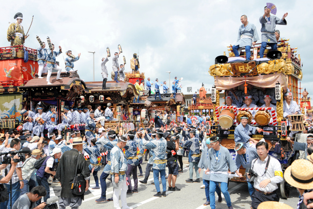 ねじり鉢巻き姿で山車の上に立つ「上乗(うわの)り」に、集まった家族連れや若者たちが手を振ったり、写真を撮ったりし8日は午後1時から、山車や屋台が参道の坂を勢いよく駆け上がる「総引き」が行われ、祭りは佳境を迎えます。