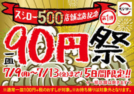 「90円祭」は、「スシロー須賀川店」(7月12日出店)のオープンにより国内出店500店舗を達成することを記念して実施されるもの。期間中は、通常1皿100円のお寿司がすべて1皿90円で提供されます。