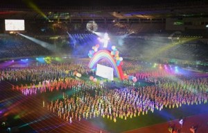 東京都での国体開催は54年ぶりで、2020年の東京五輪につながる祭典と位置づけられており、五輪にならって開会式は夕刻から実施いたしました。光や花火を使った演出で五輪開催機運を高めています。