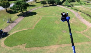 巨大地上絵は、公園を管理する市造園建設業協会のスタッフ6~7人が芝刈り機を使い、1日かけて作成したとの事です。5、6日に開催される「江津湖みなも祭り」で高所作業車から見ることができるとのことです。