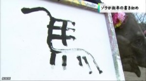 千葉県市原市の動物園で、象の「ゆめ花」が書き初めに挑戦しました。