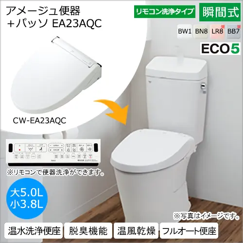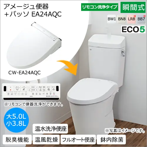LIXILで人気の温水洗浄便座、パッソのトイレセットです。脱臭×除菌、キレイ便座などきれいを保つ機能が満載!リモコン洗浄タイプです。