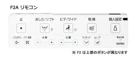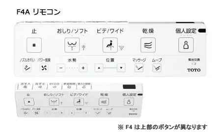 ※1 : F4系は便器内・便座裏、F3系・F2系・F1系は便器内。※2 : 「プレミスト」は「便器きれい」に含まれます。※3 : F4A・F3A・F2A・F1Aのみ。※4 : 途中で腰を浮かせたりして着座センサー部から身体が離れた場合、使用中に便器洗浄することがあります。※5 : F4系のみ瞬間暖房便座。※6 : 便座に座ると着座センサーが検知し、各機能が使えます。着座センサー部に肌が直接触れるように座ってください。